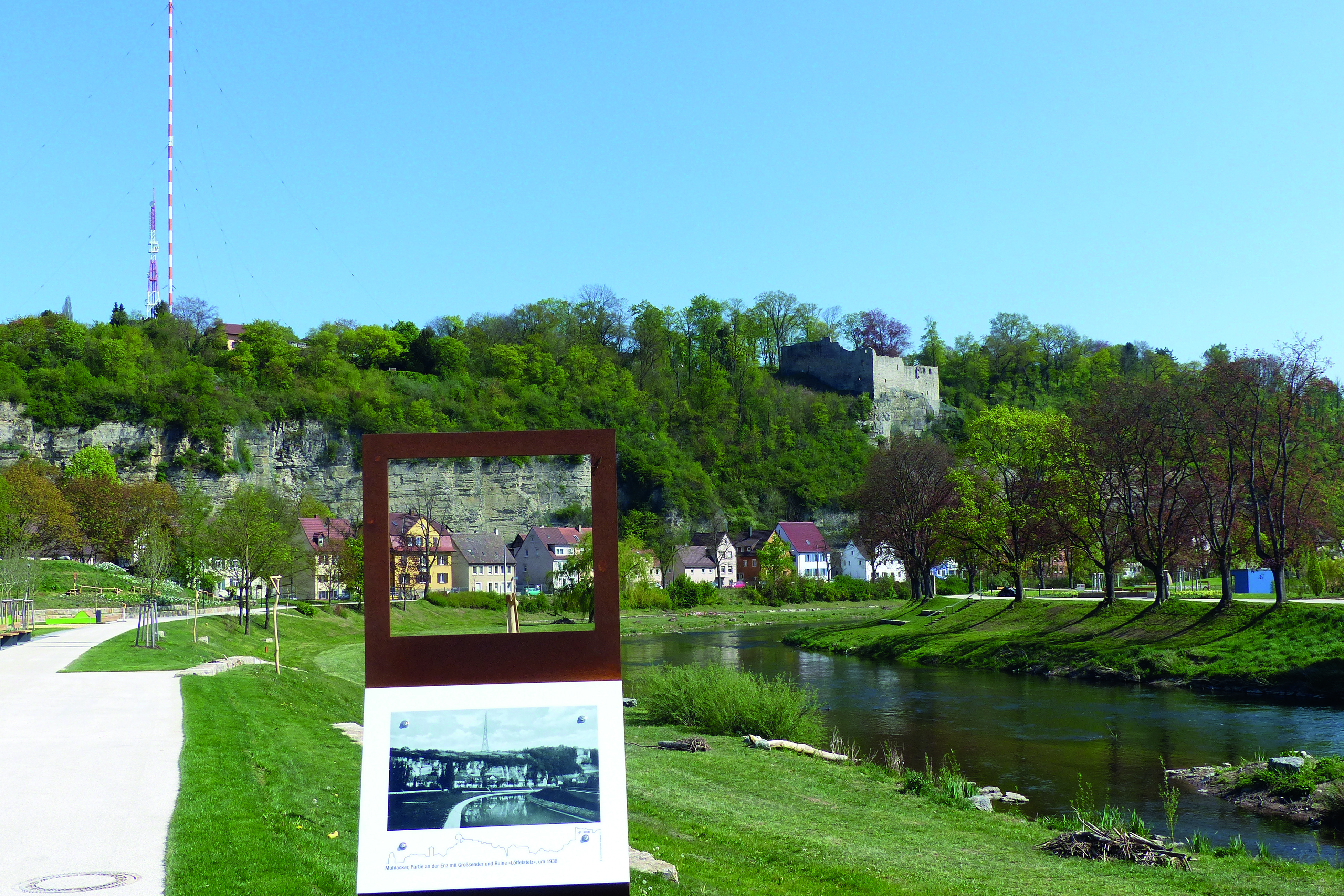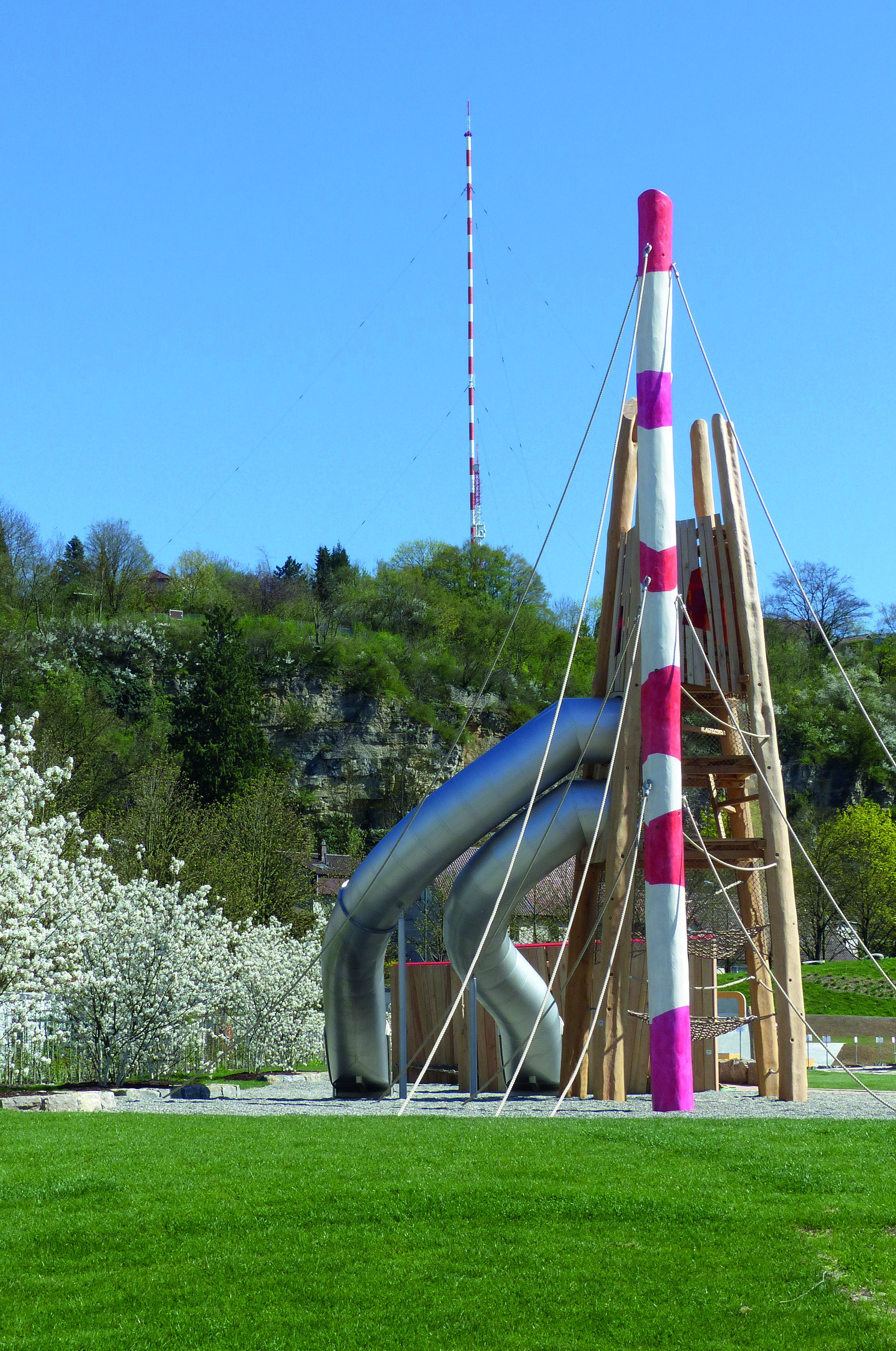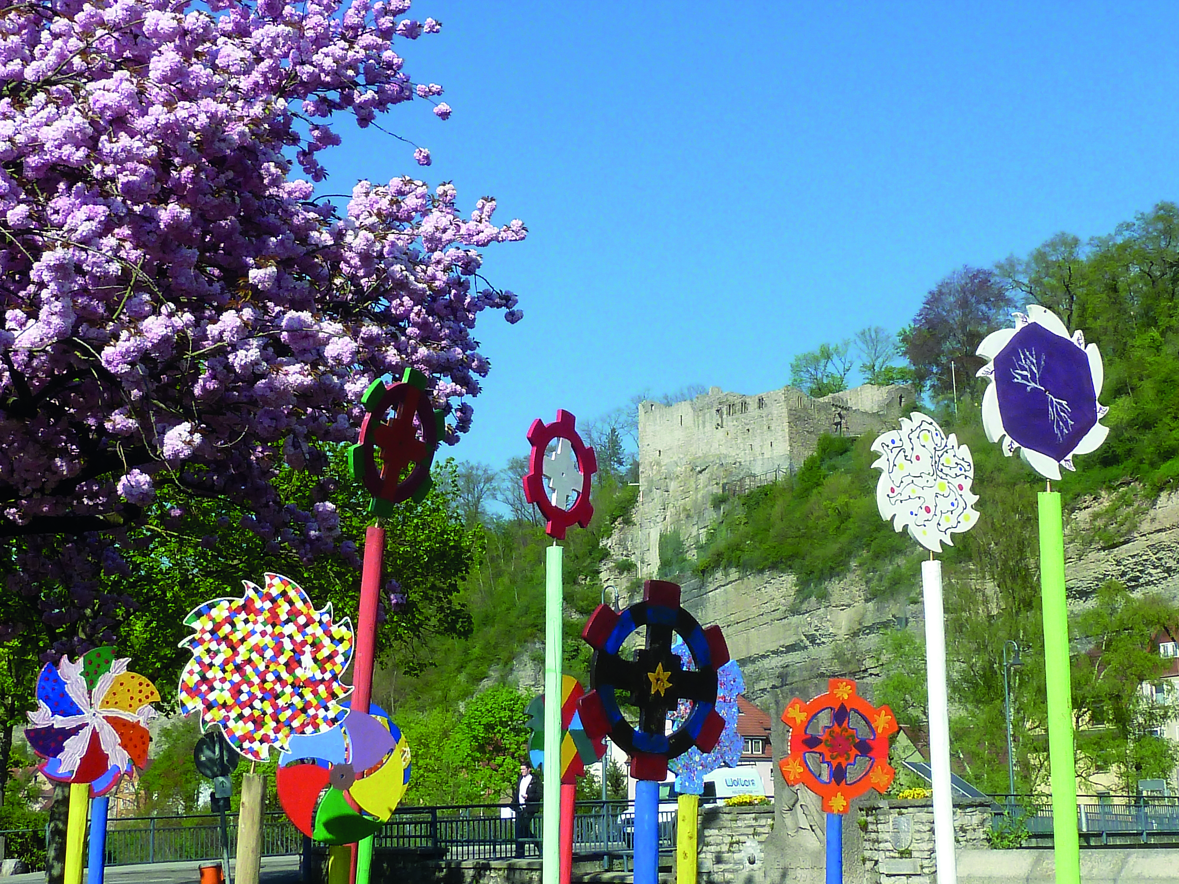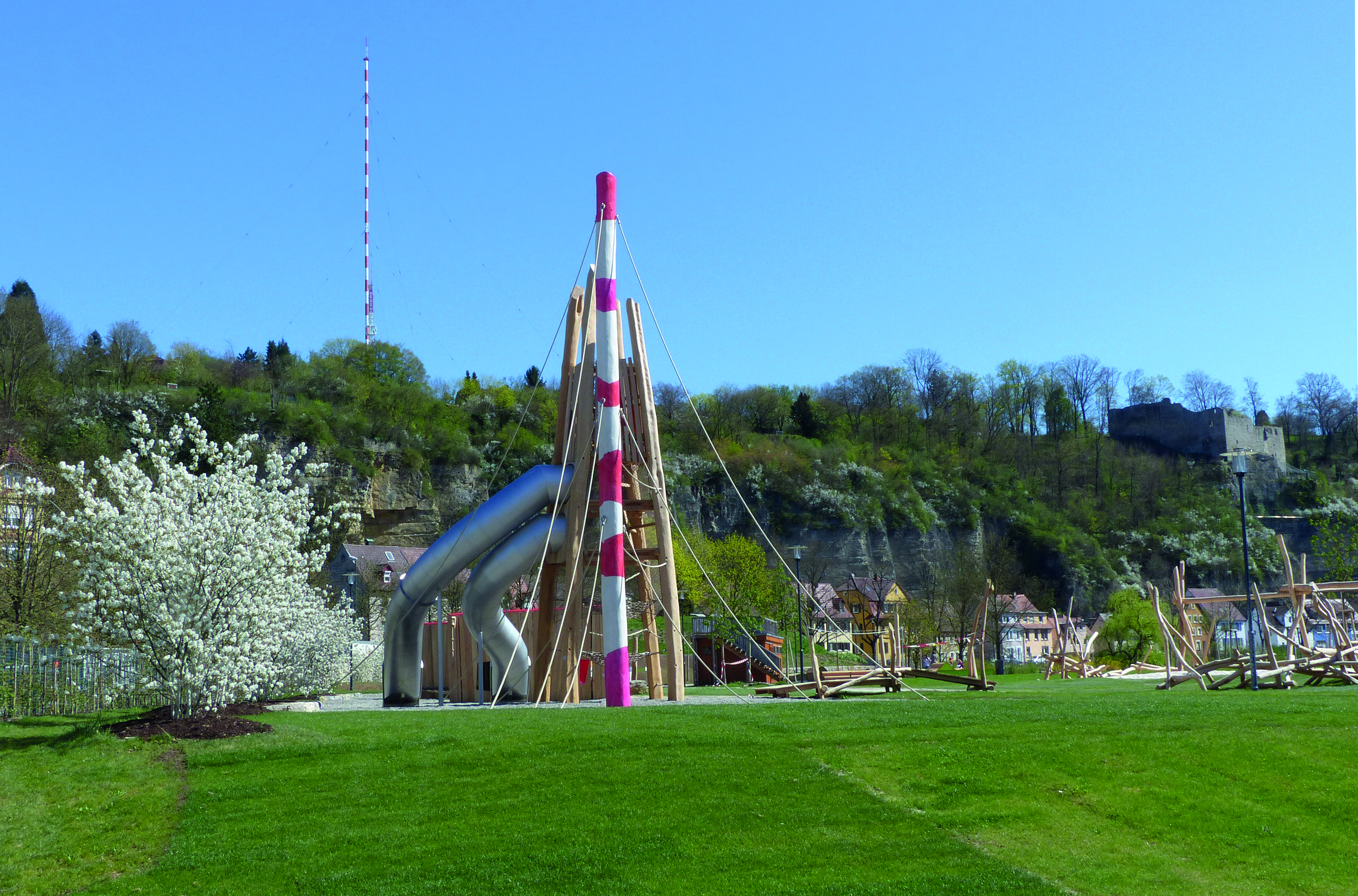 Das Spielareal Sender und Töne vor der Kulisse der Burgruine Löffelstelz