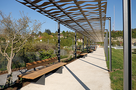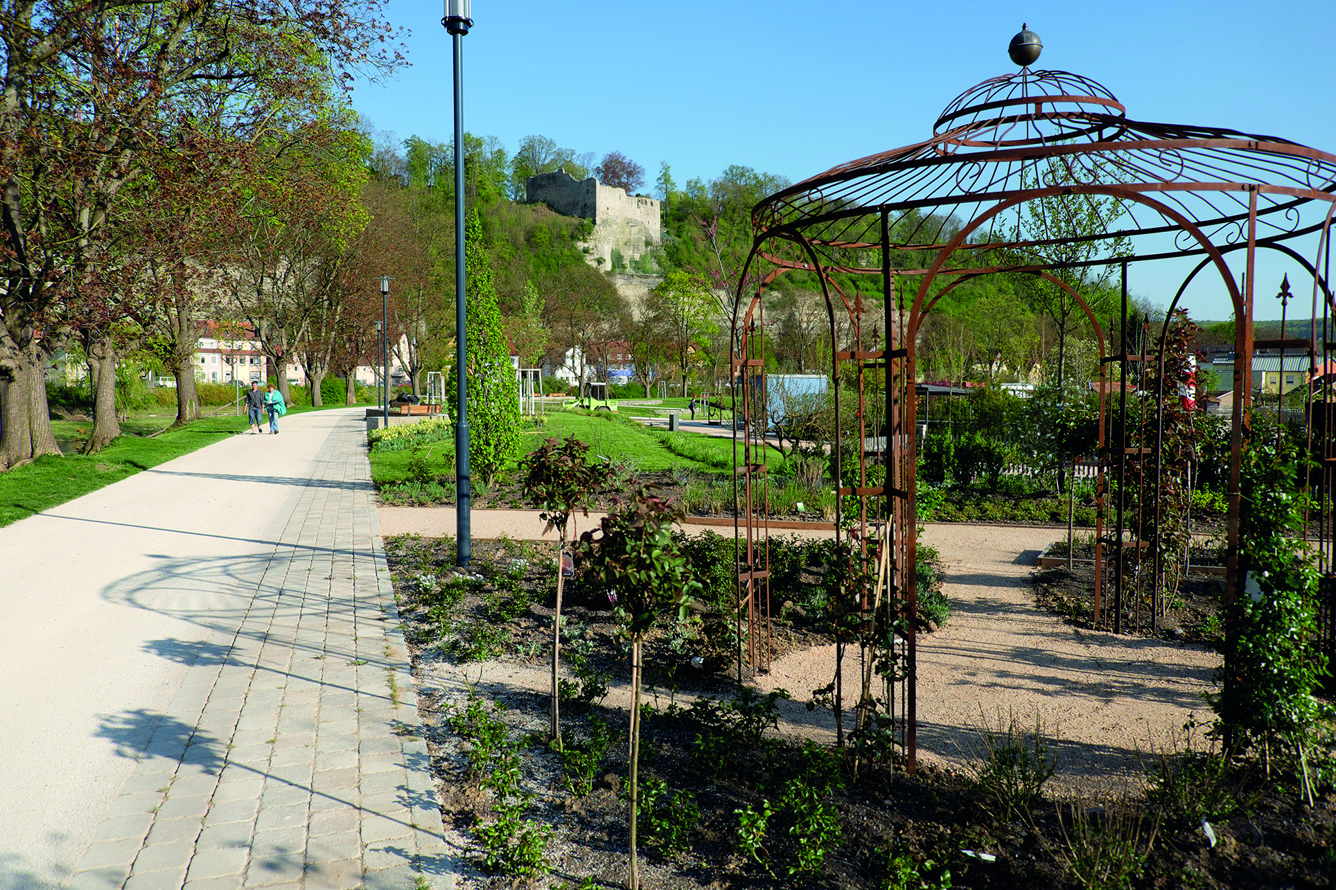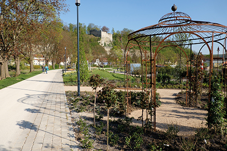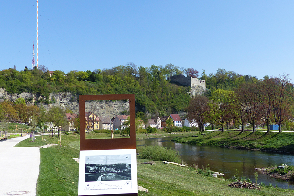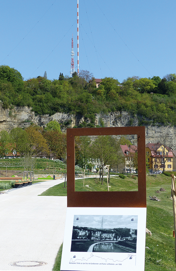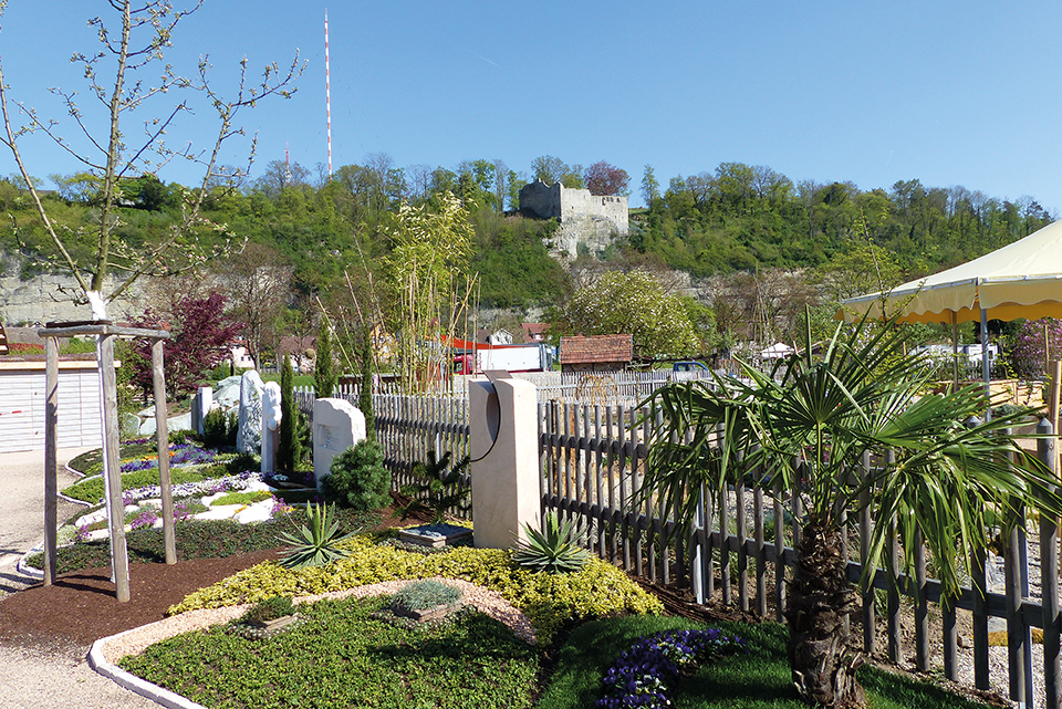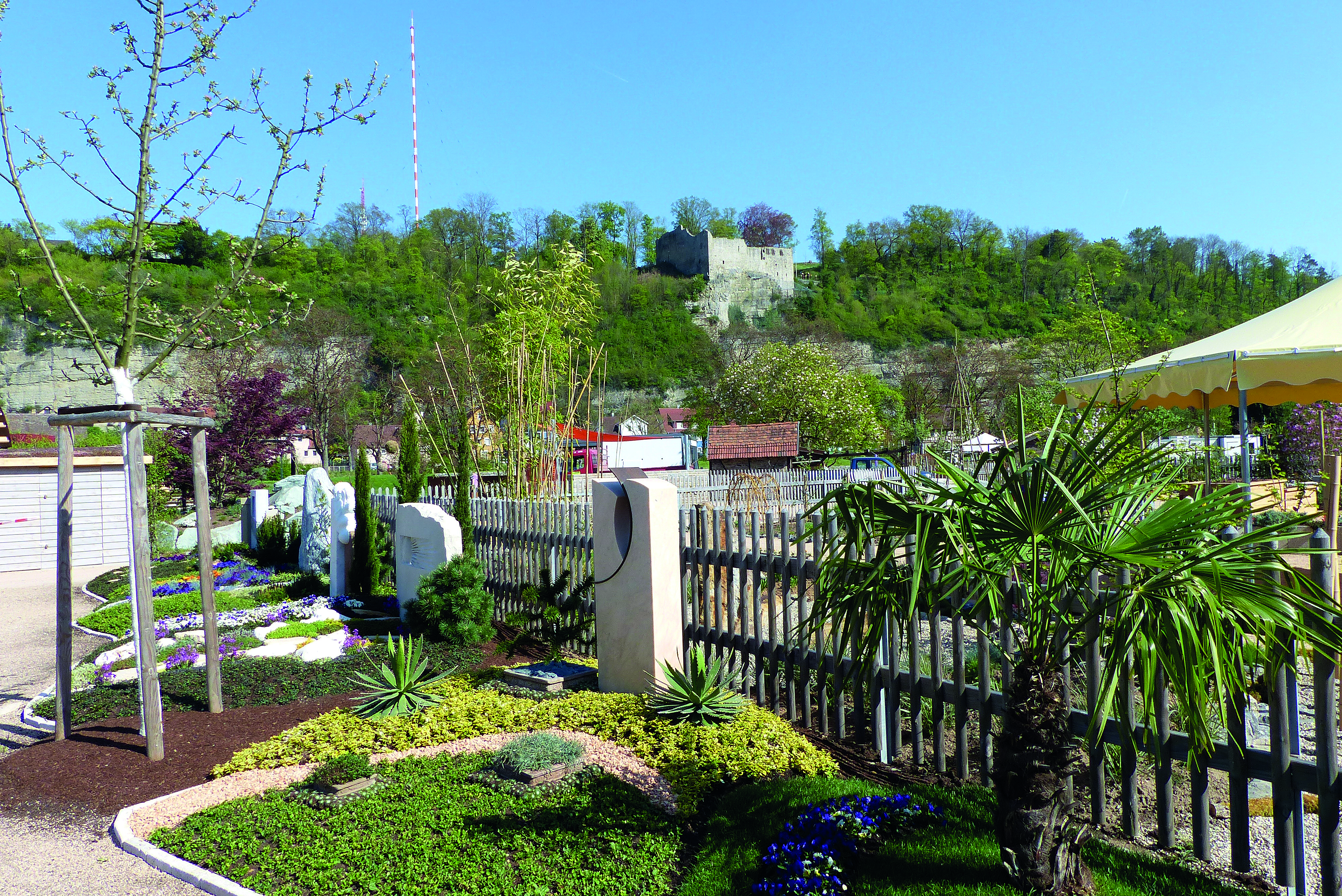 Blick vom Erinnerungsgarten der Kulturen (Friedhofgestaltung) zur Burgruine Löffelstelz