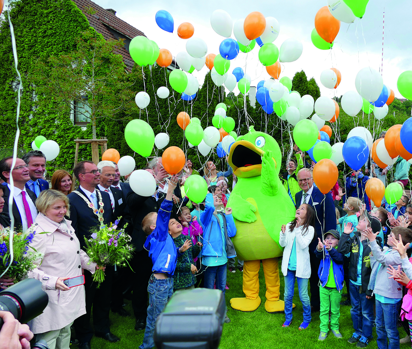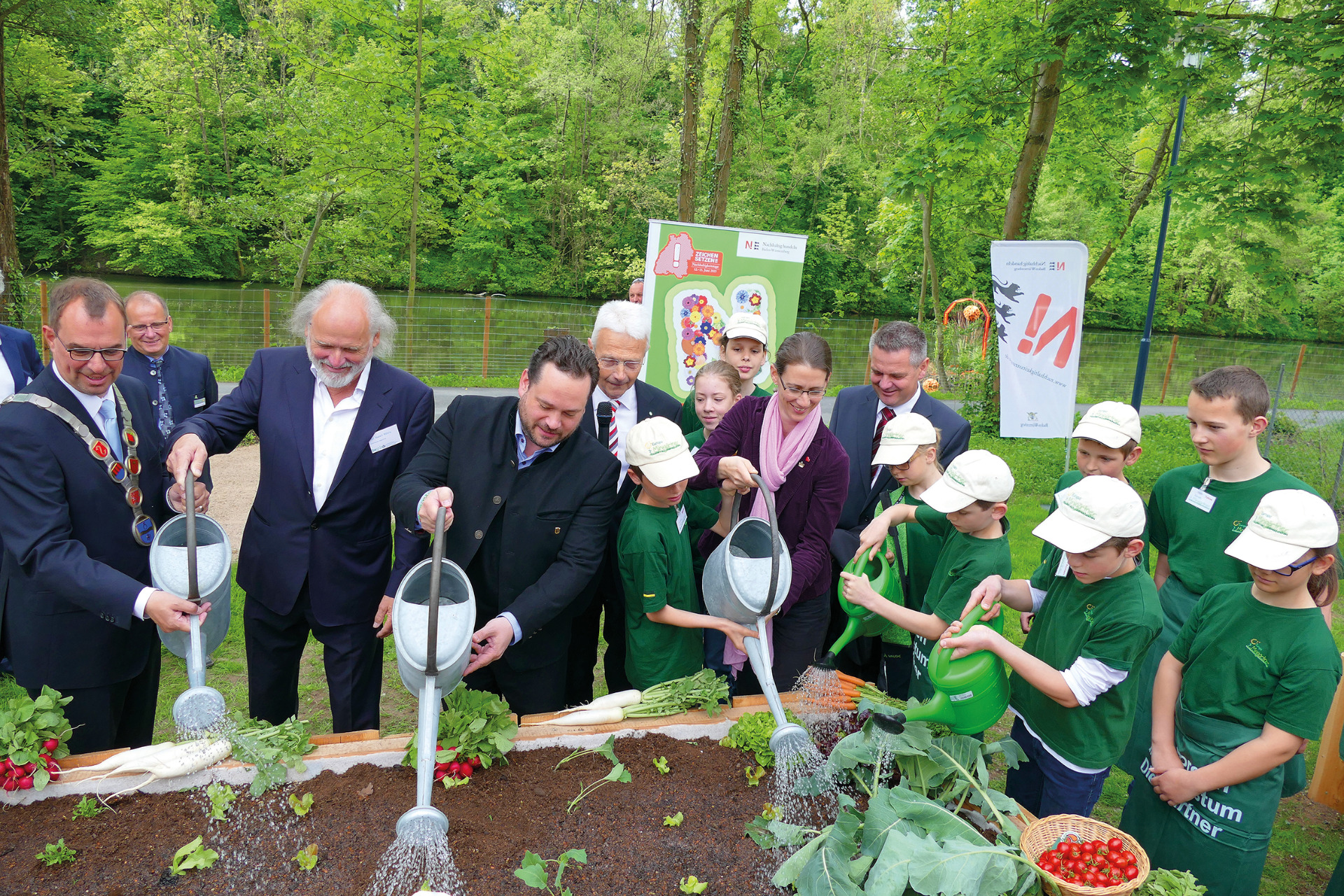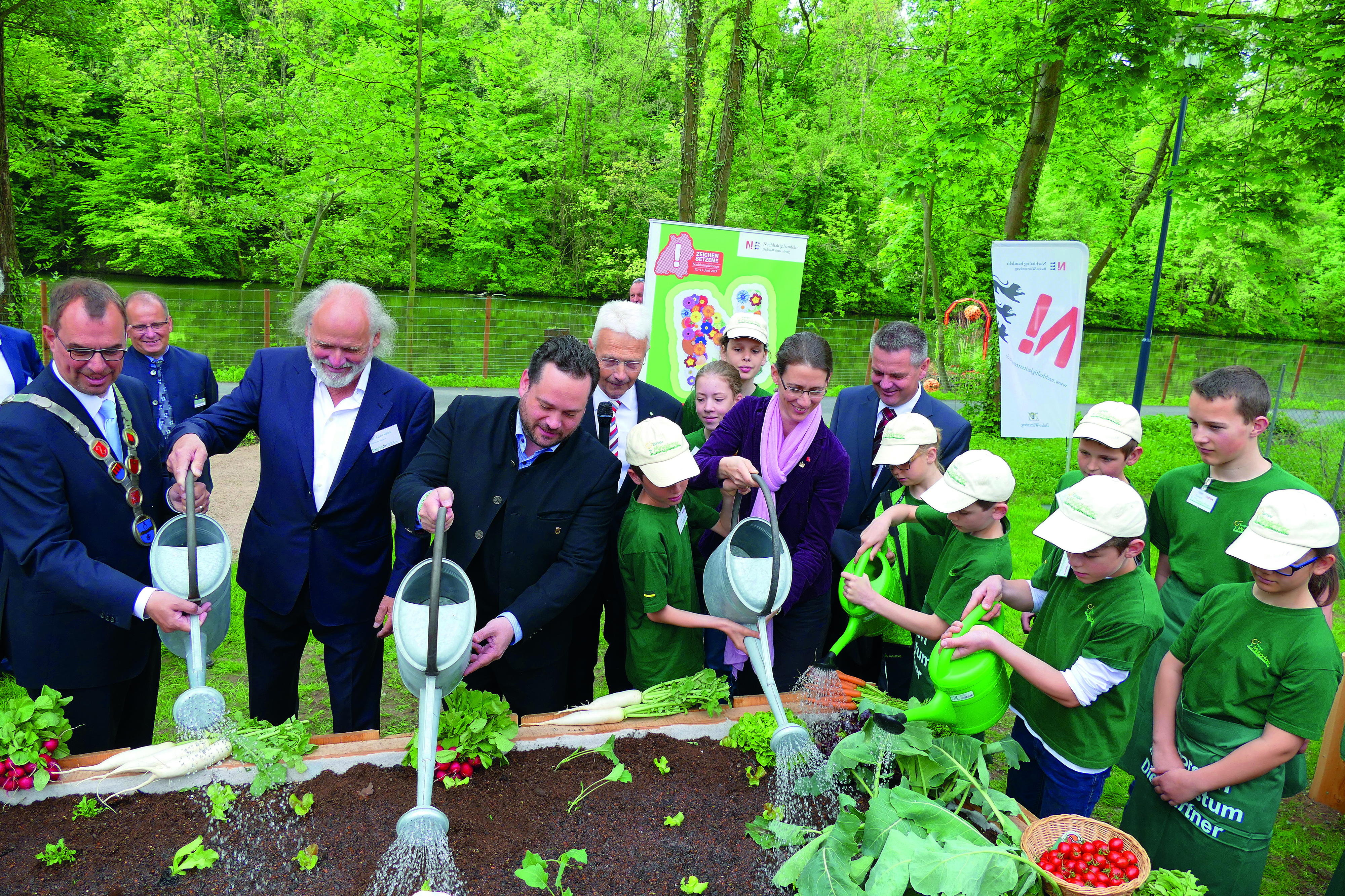 Angießen bei den Minigärtnern v.l.: Oberbürgermeister Frank Schneider, Prof. Hubert Möhrle, Landwirtschaftsminister Alexander Bonde und Bettina Gräfin Bernadotte